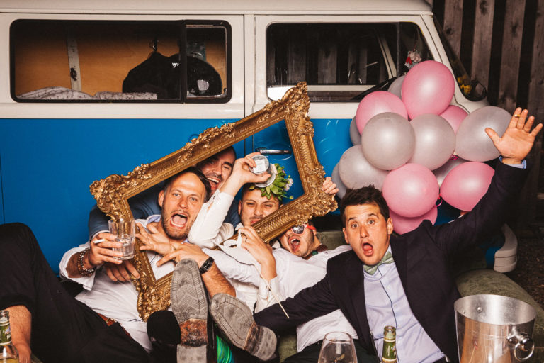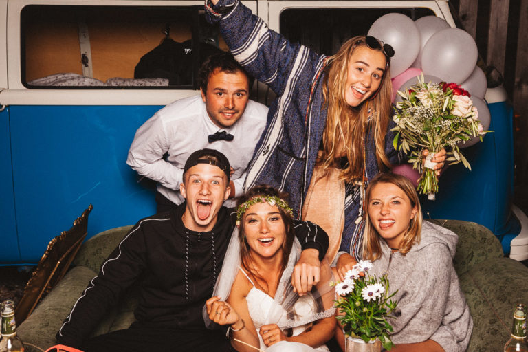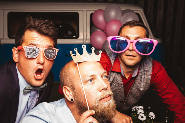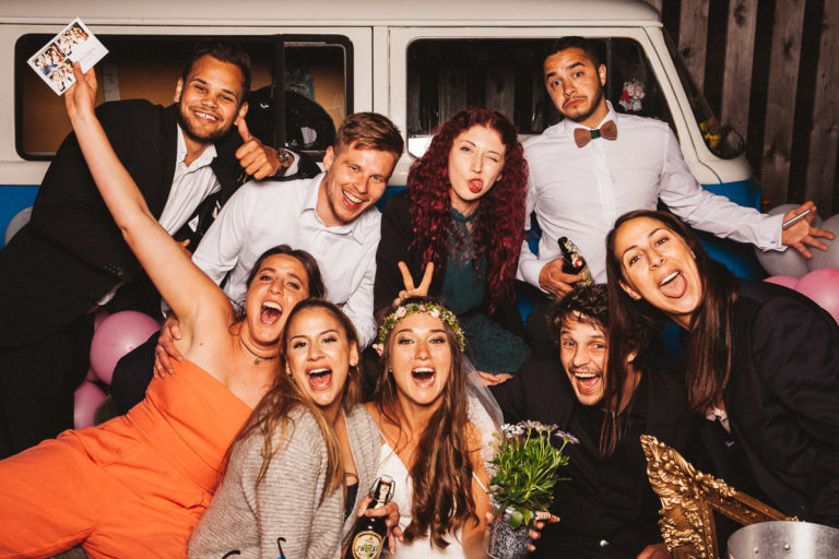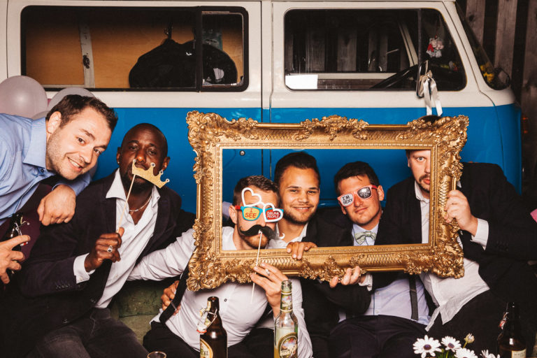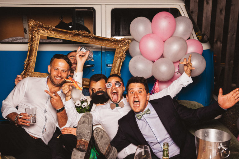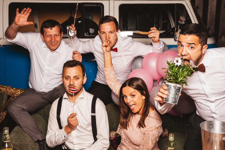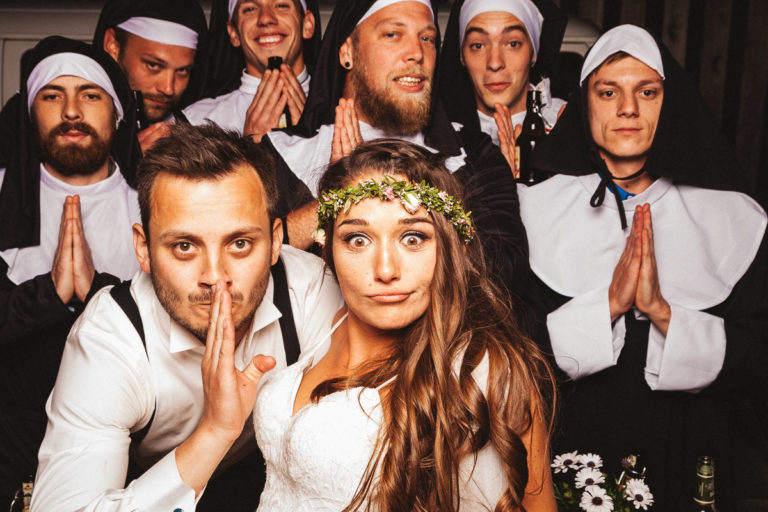 Dass die Fotokiste Ravensburg so gut ankam ist auch auch der lieben Trauzeugin der Braut zu verdanken, die sich ein Spiel mit den Gästen ausgedacht hat. Dabei wurden an allen Plätzen verschiedene Symbole verteilt. Jedes Symbol gab es genau zwei Mal und man musste sein passendes Symbol finden und mit dieser Person ein gemeinsames Foto an der Fotokiste bzw. dem Photobooth machen. Das sorgte dafür, dass es keine Grüppchenbildung gab und sich zuvor fremde Personen für ein gemeinsames Spaßfoto an der Fotokiste wiederfanden. Als die Trauzeugin gesehen hat, wie gut ihre Idee funktioniert, musste sie sich dann auch ein paar Tränen verdrücken. Ich denke die Ergebnisse können sich sehen lassen und natürlich ist Alkohol bei solch Bildern nicht unbedingt von Nachteil.