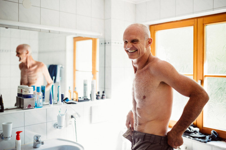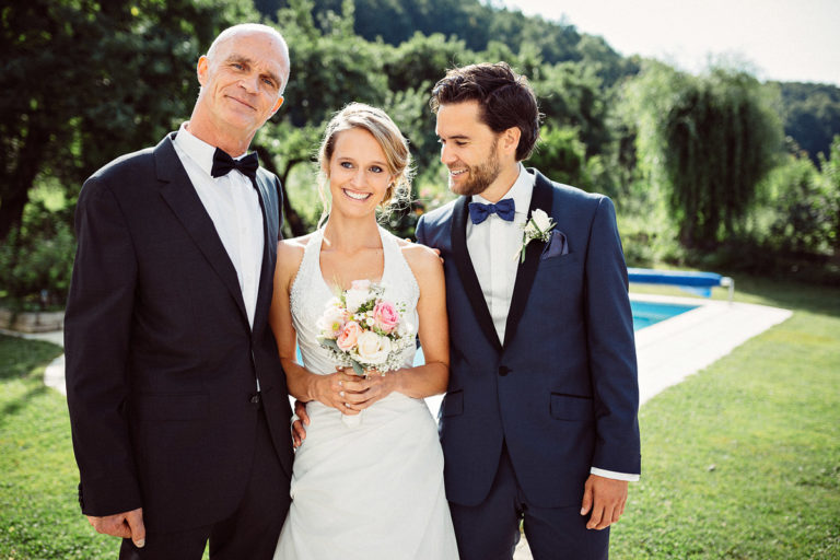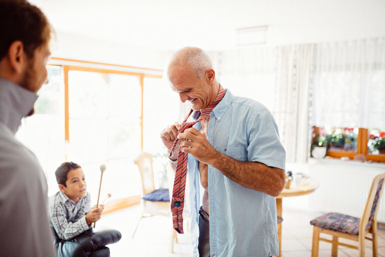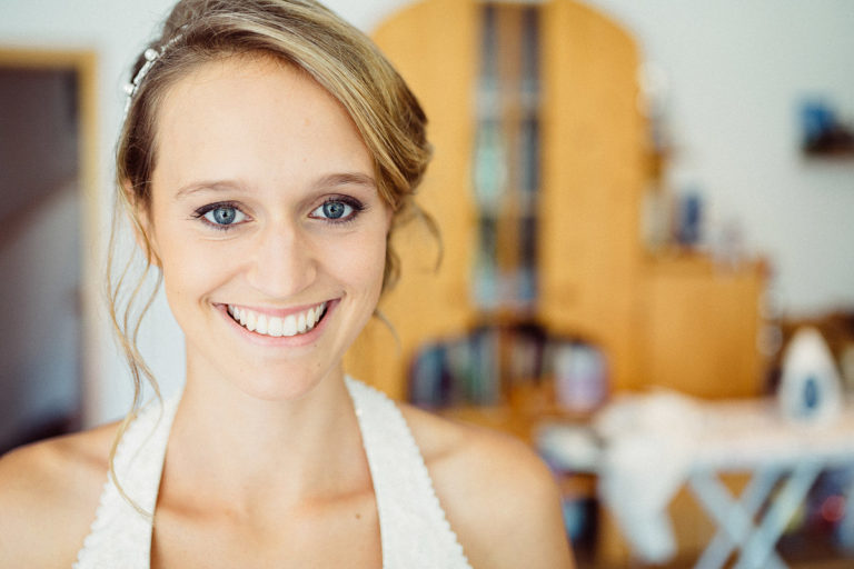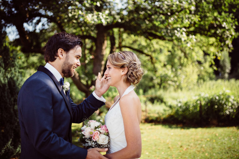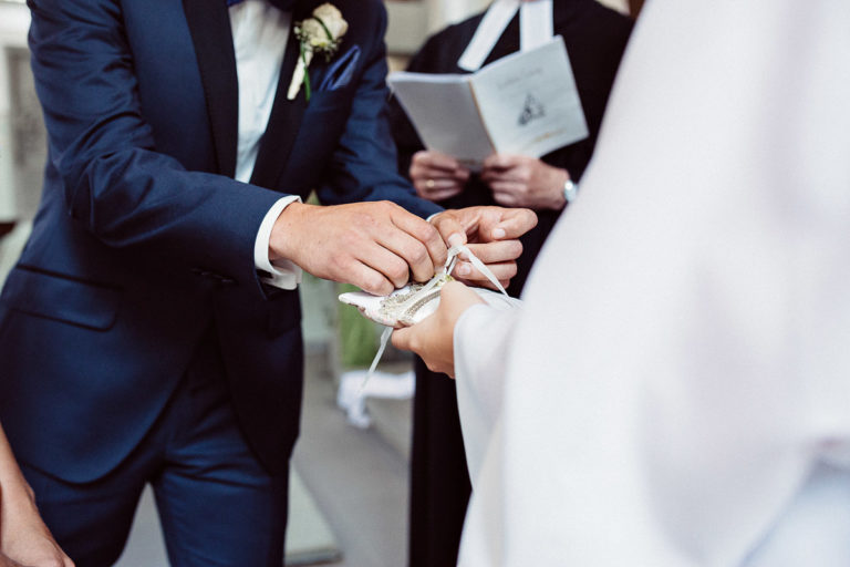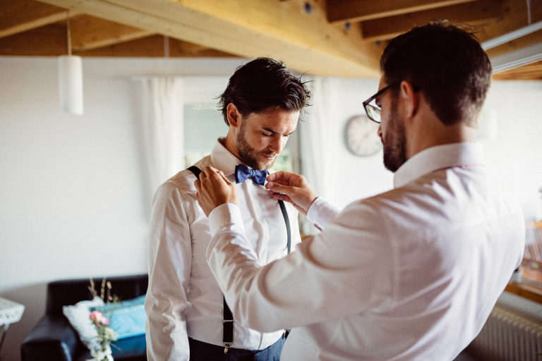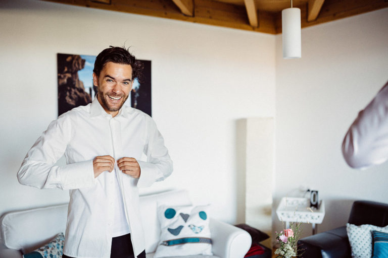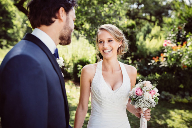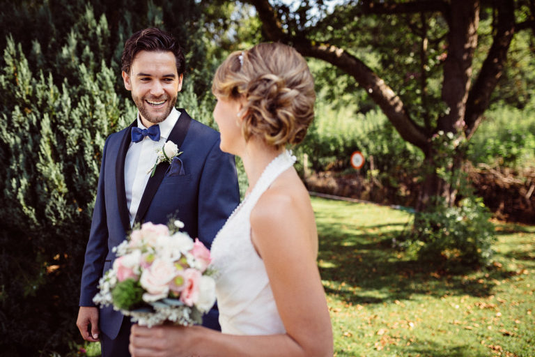 Bei Eva und Markus durfte ich ebenfalls den ganzen Hochzeitstag begleiten. Zuerst war ich beim Bräutigam in der gemeinsamen Wohnung. Voller Vorfreude dachte der Markus wohl, dass man sich auch mal seinen kleinen Zeh anschlagen könnte, zum Glück war die Kamera auch in diesem Moment dabei. Ich denke beim Anblick des Fotos wird er sich auch heute noch an diesen “tollten” Moment der Vorbereitung zurückerinnern können. Danach ging es für mich zur Braut, welche sich beim Vater richtete. Dort wurde sie dann auch im tollen Garten beim *First Look* vom Bräutigam abgeholt.